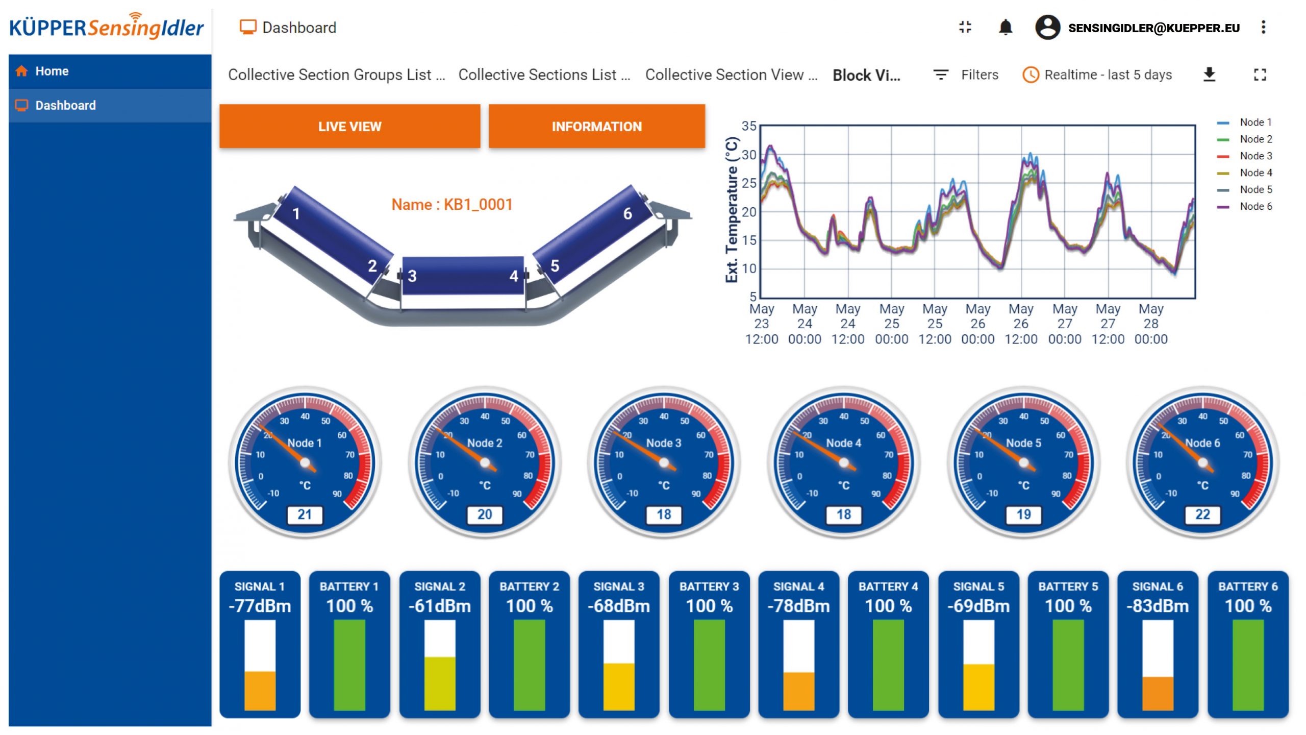 Die intelligenten Tragrollen senden kontinuierlich alle relevanten Zustandsinformationen für den Betreiber in die Cloud. Neben einer übersichtlichen Darstellung der Zustände in einem Dashboard werden Unregelmäßigkeiten oder gar kritische Zustände per Push-Benachrichtigung an den Betreiber gemeldet. Die beschriebenen Cloud-Funktionen können bei Bedarf auch in bestehende Condition Monitoring Systeme integriert werden, um eine noch höhere Benutzerfreundlichkeit zu erreichen. Mit diesem Tool können geplante Tragrollenwechsel auf Basis der individuellen Zustandswerte optimiert und priorisiert werden, wodurch das Risiko von Heißläufern und den daraus resultierenden unerwarteten Produktionsausfällen deutlich reduziert wird.