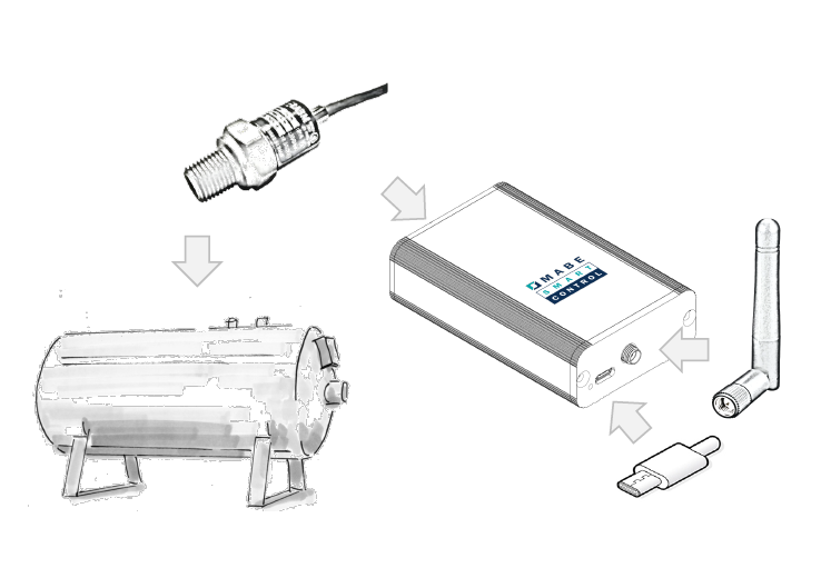 Das Plug&Play fähige Messsystem besteht aus einem Drucksensor + IoT Sensorknoten und kann über eine Schnellkupplung, einfach an bestehende oder neue Druckbehälter montiert werden. Der IoT Sensorknoten wird über einen Standard USB-C Netzteil versorgt und kann ab diesem Zeitpunkt als autarker Sensorknoten fungieren.